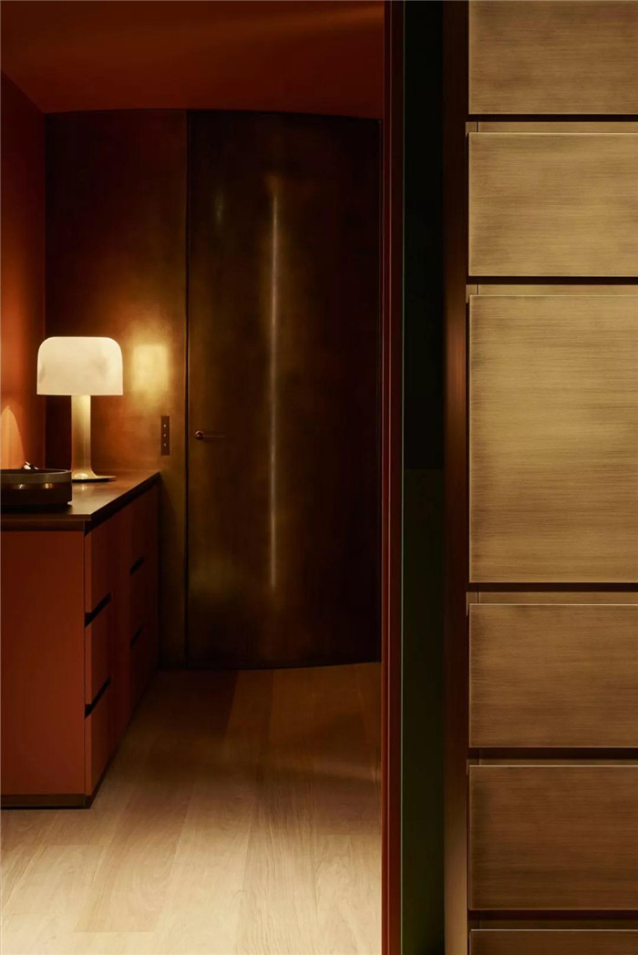 设计师在室内使用了丰富的天然材质,单独定制的曲线铜门在泛黄的光线晕染下,彰显着华丽且复古的魅力。