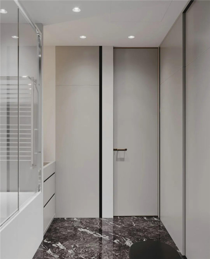 卫生间地面选用黑色铺贴,使得原本简约的空间多了一抹重色,整个空间更显精致时尚的质感!